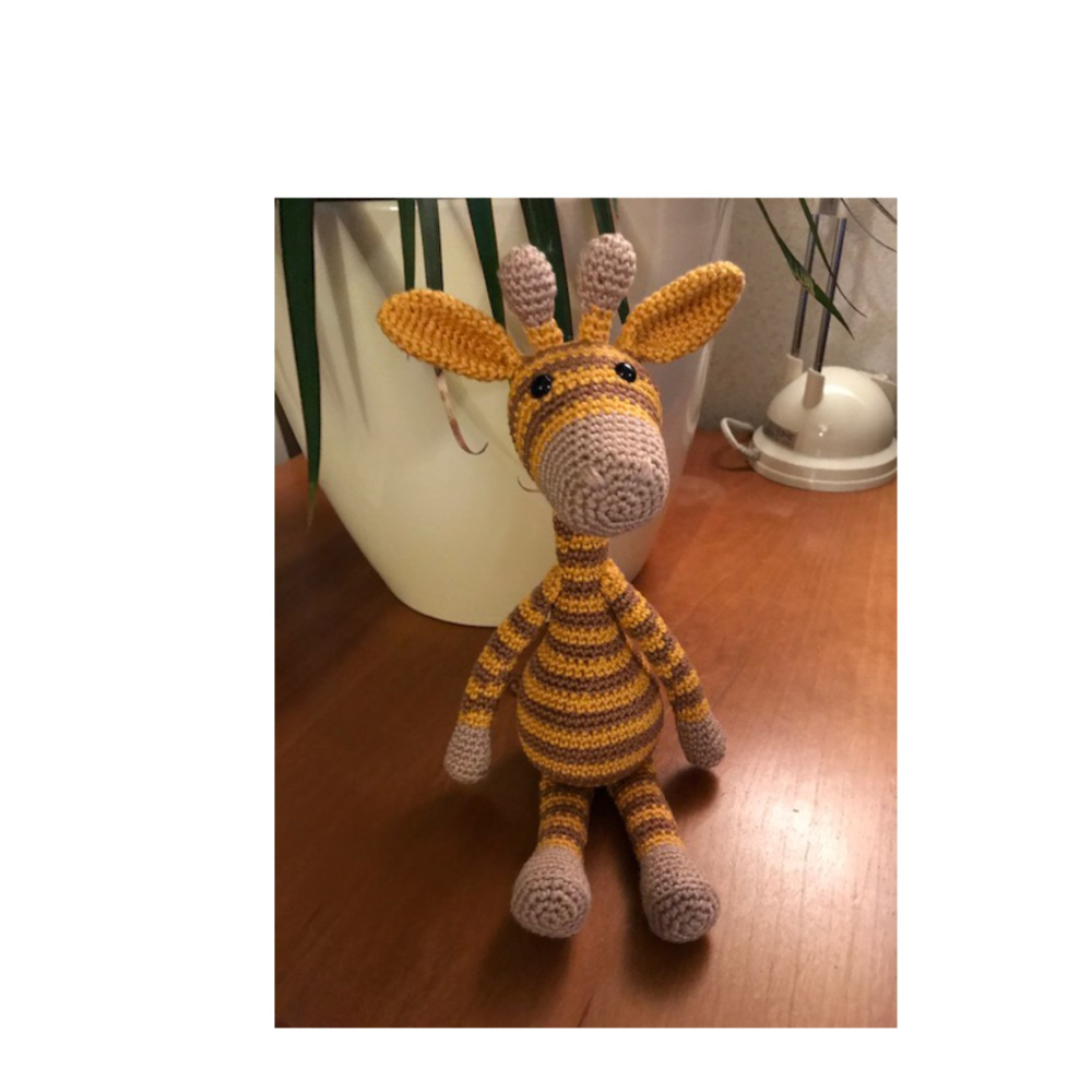 Gijs giraf is gehaakt van 100% katoen en is ongeveer 25cm groot. Deze is op verzoek in deze kleuren gemaakt, maar kan aangepast worden aan kleuren naar wens.
