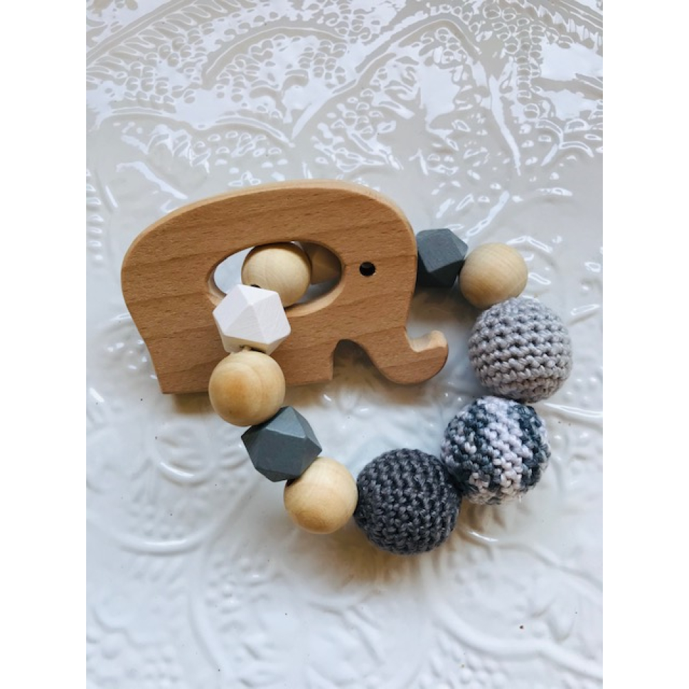 Deze bijtring heeft een houten olifant geregen aan een ring met houten en gehaakte kralen. De kralen zijn gehaakt met 100% katoen.