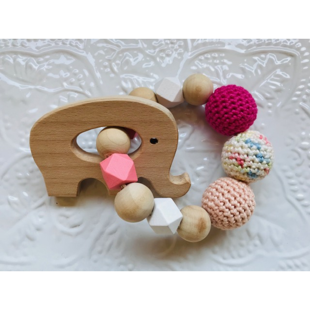 Deze bijtring heeft een houten olifant geregen met houten en gehaakte kralen. De gehaakte kralen zijn van 100% katoen.
