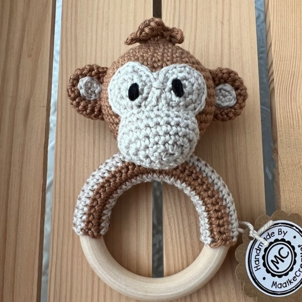 Deze rammelaar is gemaakt van 100% katoen en rondom vast genaaid op een houten bijtring van 7cm. Vanwege de veiligheid heeft de rammelaar geborduurde oogjes.