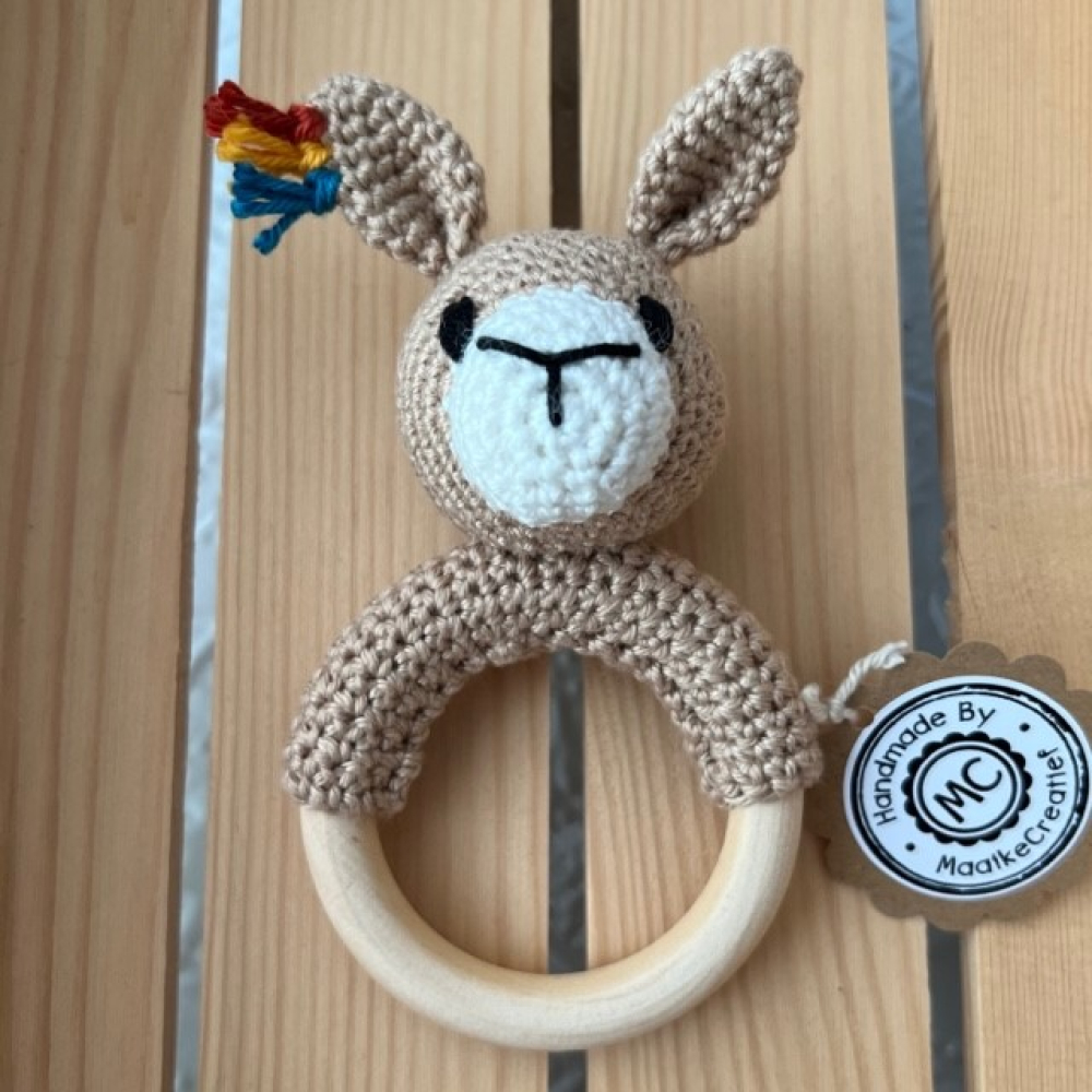 Deze rammelaar is gemaakt van 100% katoen en rondom vast genaaid op een houten bijtring van 7cm. Vanwege de veiligheid heeft de rammelaar geborduurde oogjes.