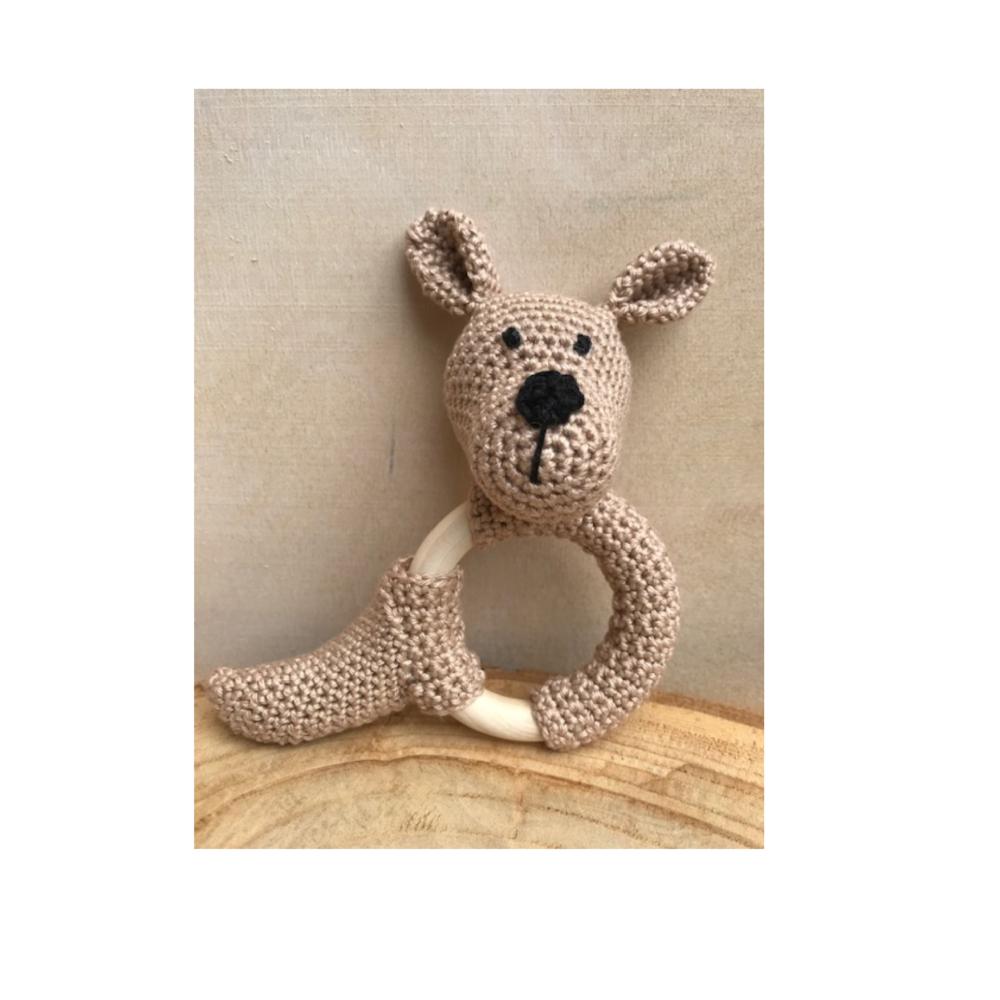 Deze rammelaar is gemaakt van 100% katoen en is vastgenaaid op een houten bijtring van 7cm. De oogjes zijn vanwege de veiligheid geborduurd op de rammelaar.