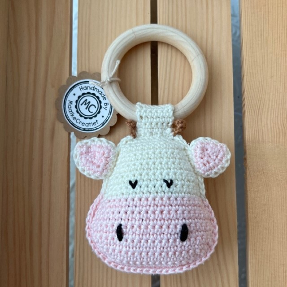 Deze rammelaar is gemaakt van 100% katoen en rondom vast genaaid op een houten bijtring van 7cm. Vanwege de veiligheid heeft de rammelaar geborduurde oogjes.
