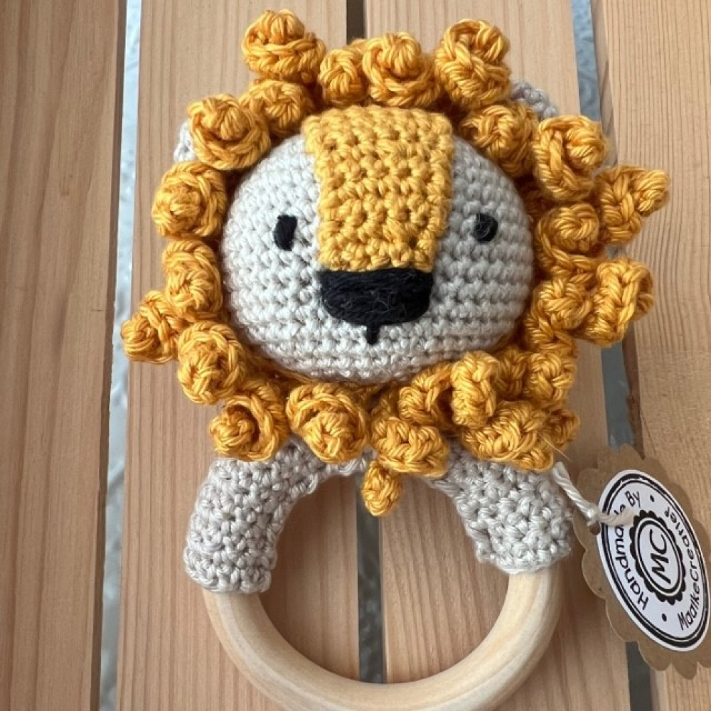 Deze rammelaar is gemaakt van 100% katoen en rondom vast genaaid op een houten bijtring van 7cm. Vanwege de veiligheid heeft de rammelaar geborduurde oogjes.