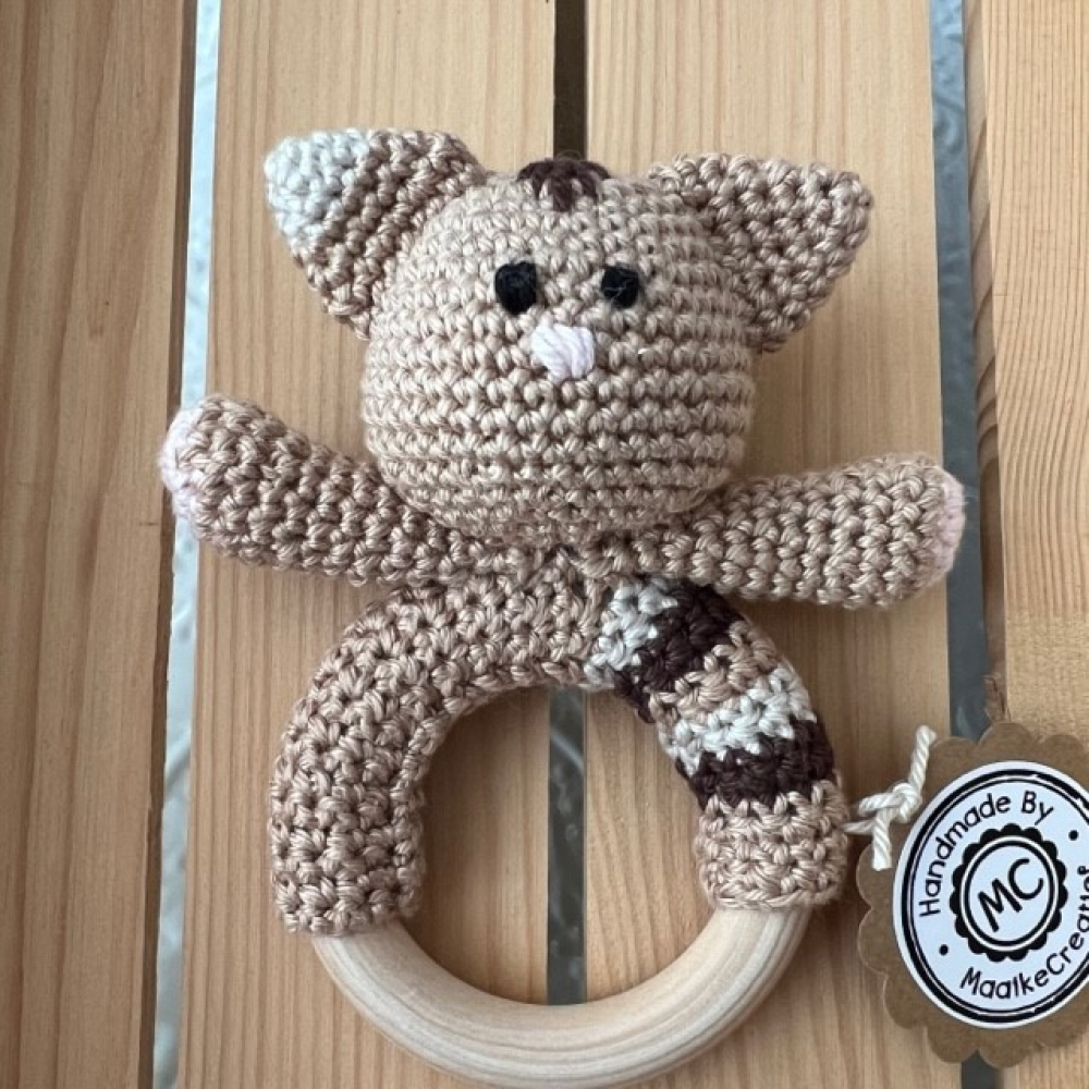 Deze rammelaar is gemaakt van 100% katoen en rondom vast genaaid op een houten bijtring van 7cm. Vanwege de veiligheid heeft de rammelaar geborduurde oogjes.