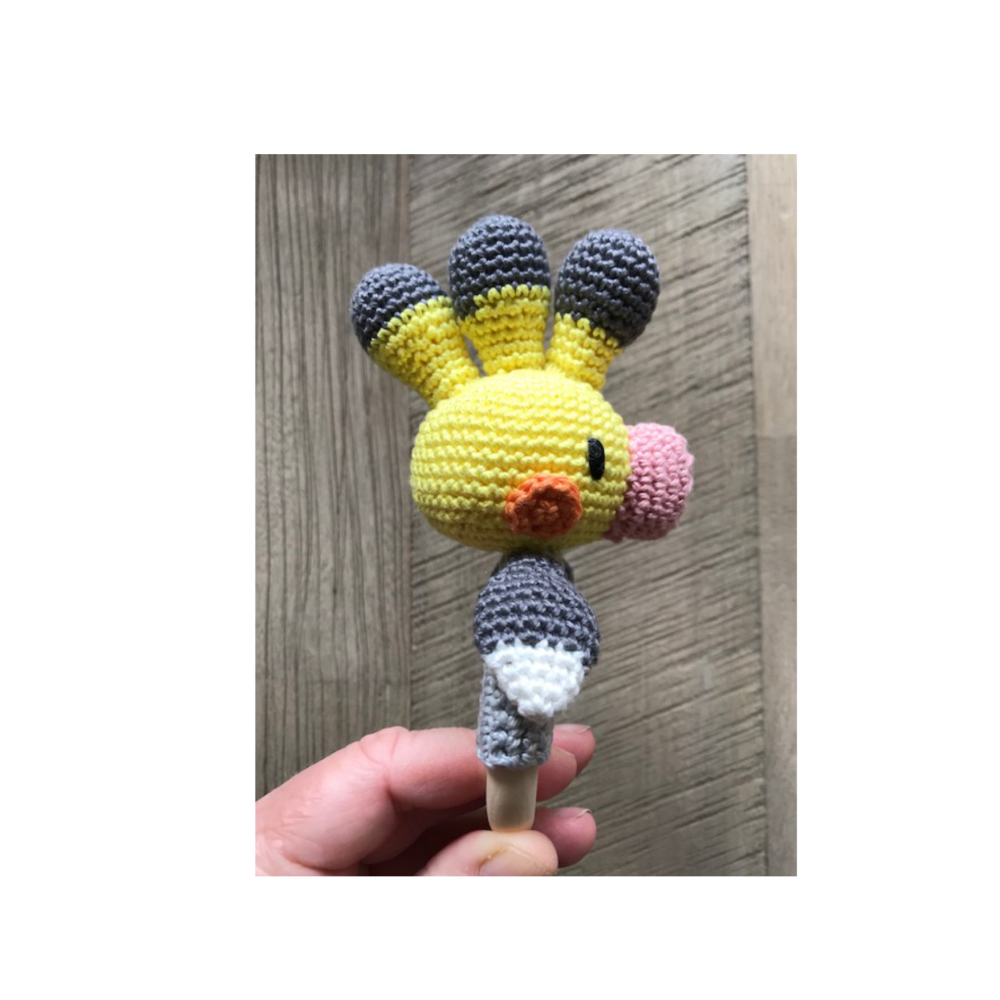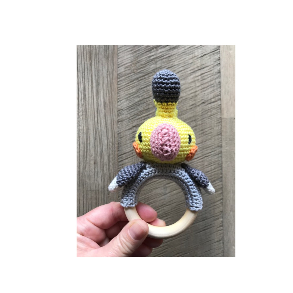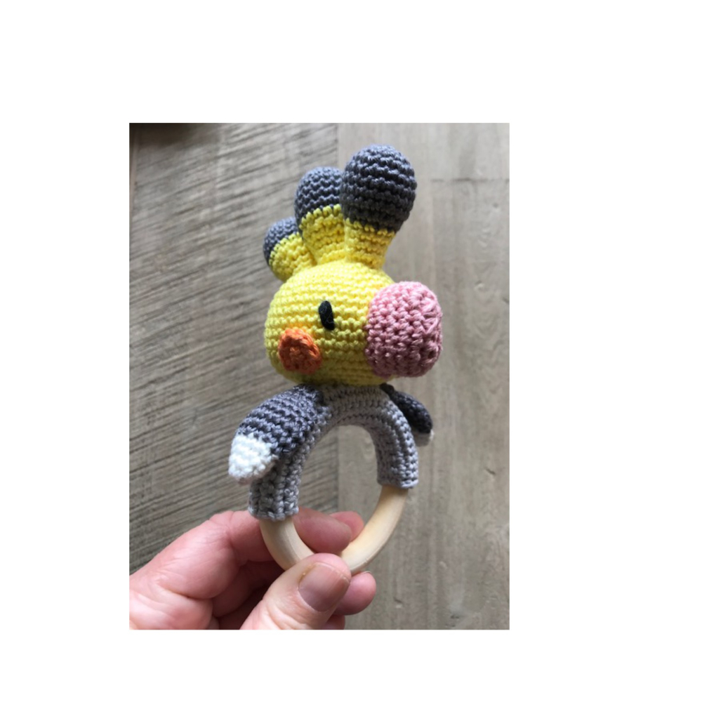 Deze vrolijke valkparkiet rammelaar wil graag jouw vriendje zijn. Hij is gemaakt van 100% katoen en is bevestigd op een 7cm houten (bijt)ring.