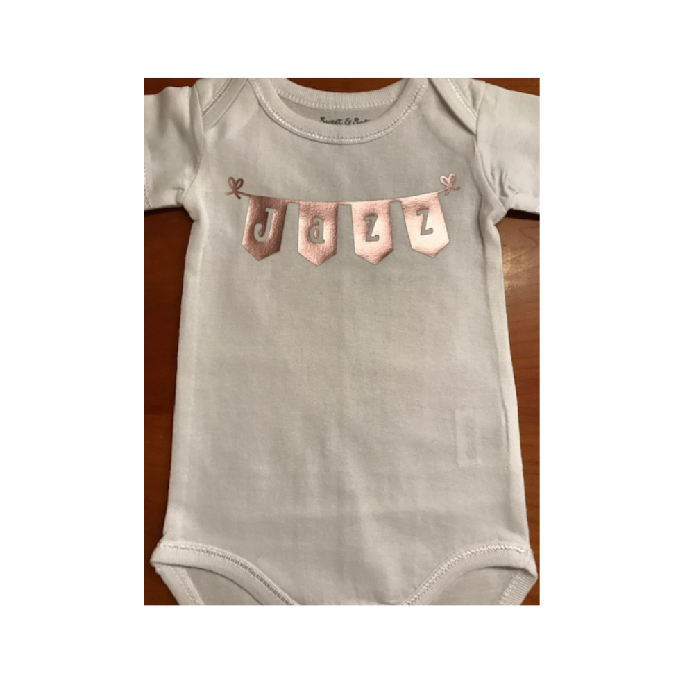 Dit rompertje is gemaakt voor Jazz, maar kan aangepast worden in elke naam en voor een jongen ook nog in het blauw.
