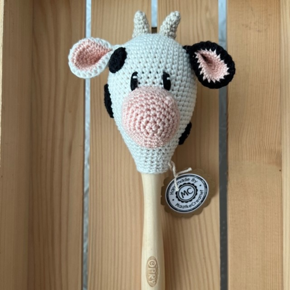 Dit is een houten sambabal van 20 x 6 cm, omgehaakt met 100% katoenen garen.